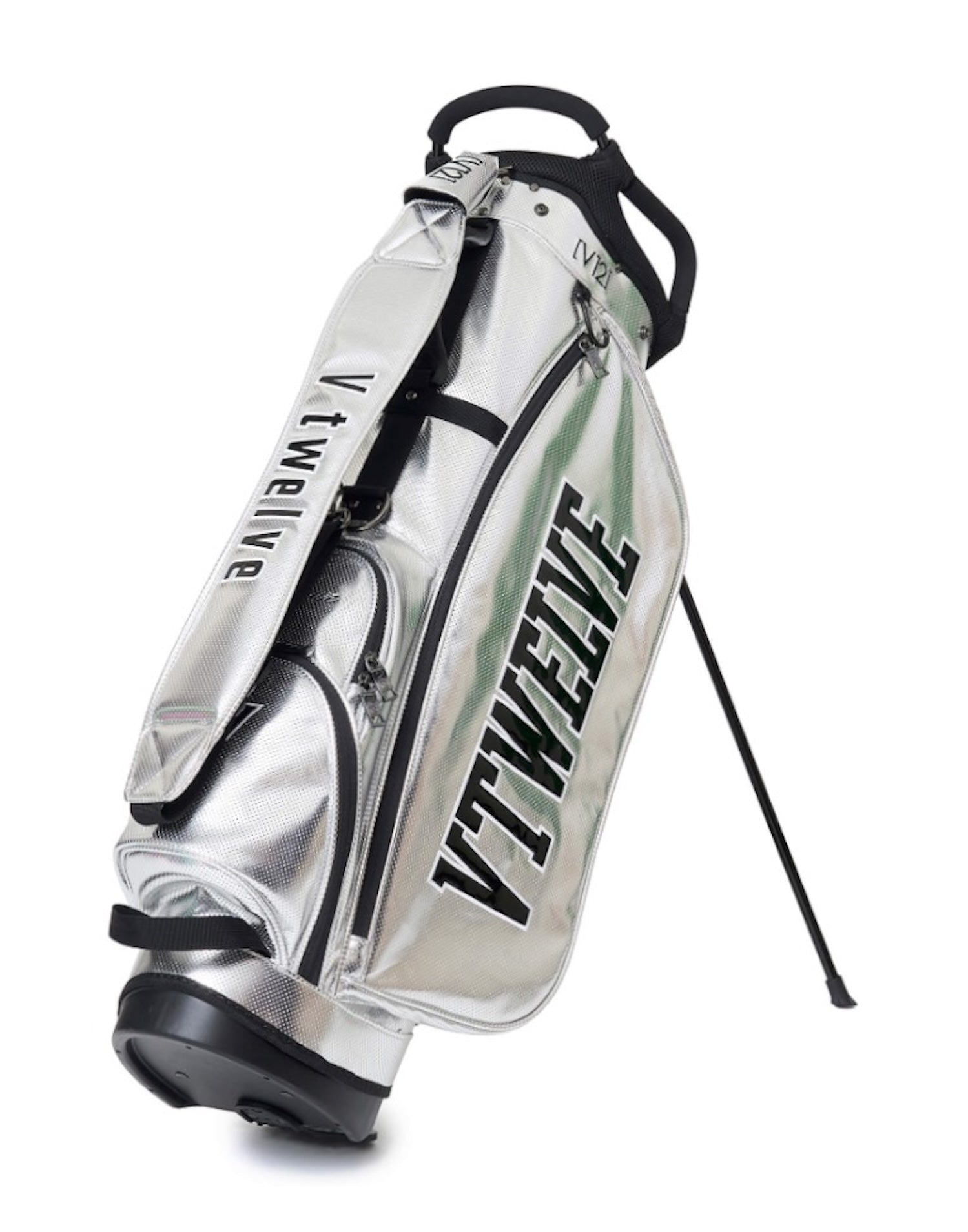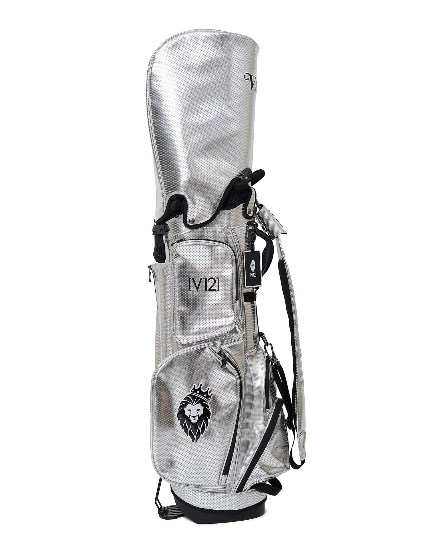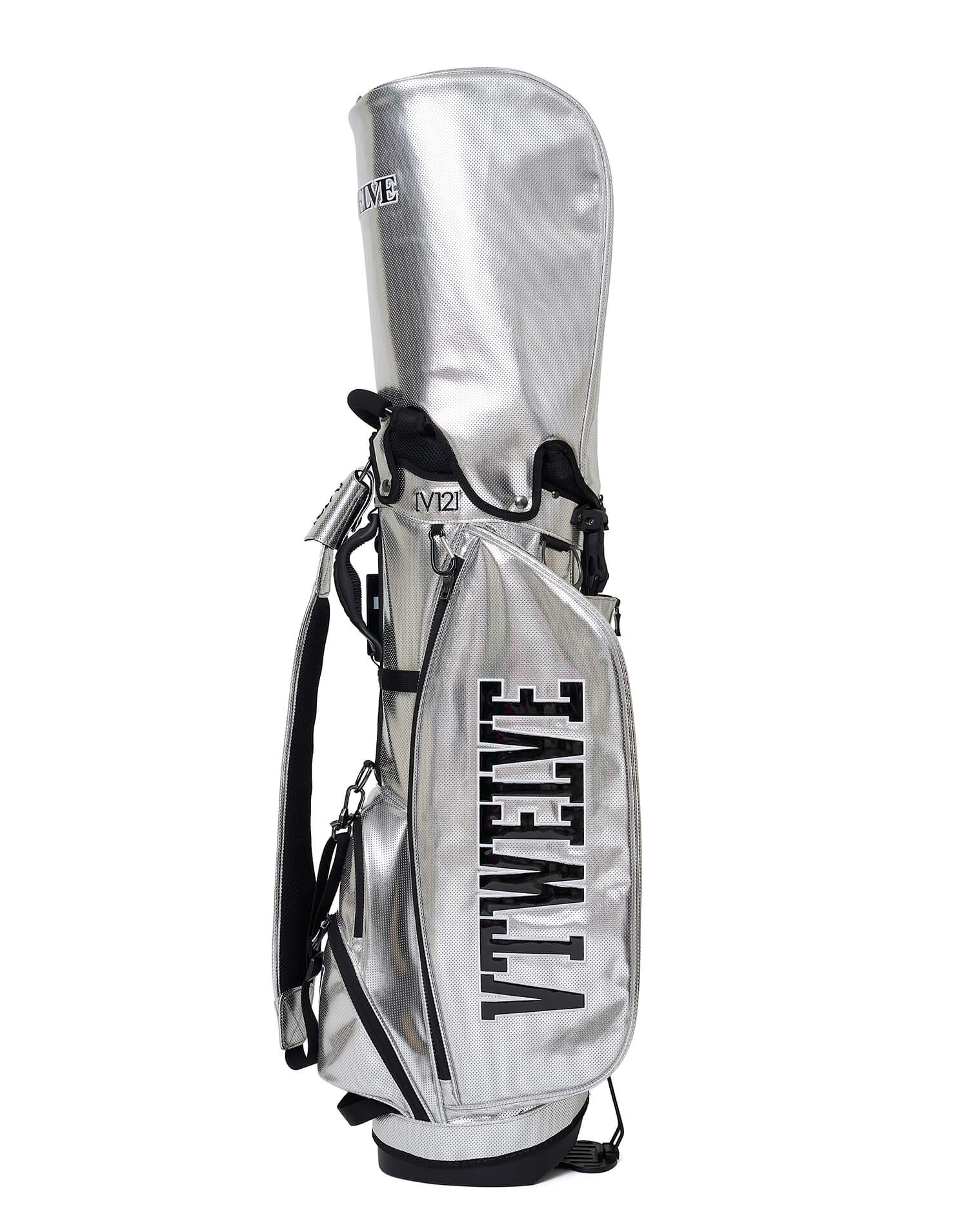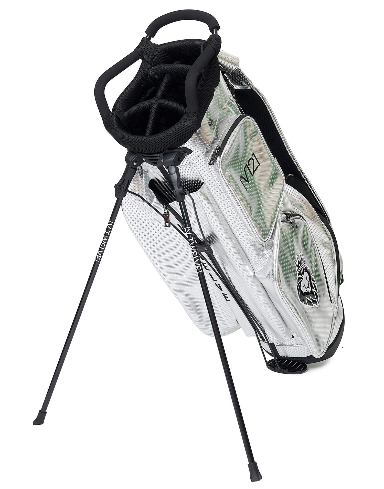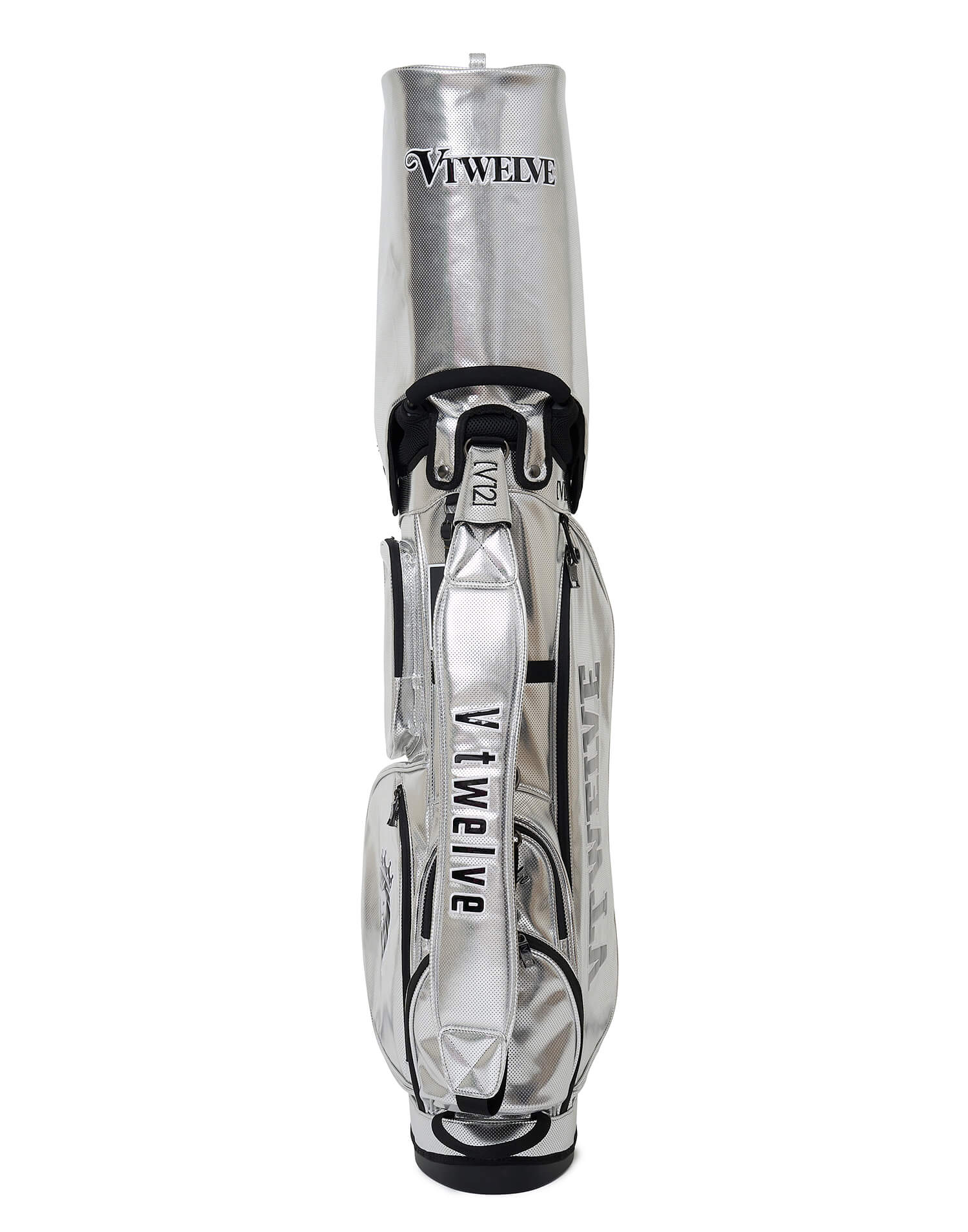 さまざまなV12ロゴをコントラストで表現した9インチのスタンドキャディバッグ。