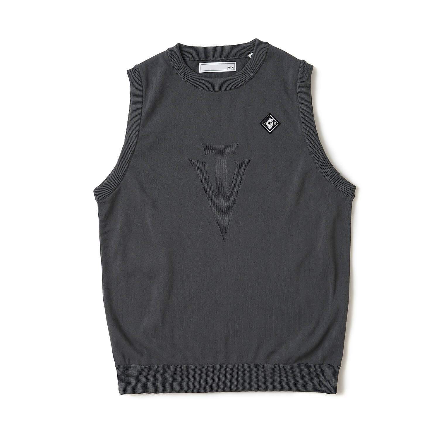 シンボルロゴを同色で編み立てたミニマルデザインのニットベスト。